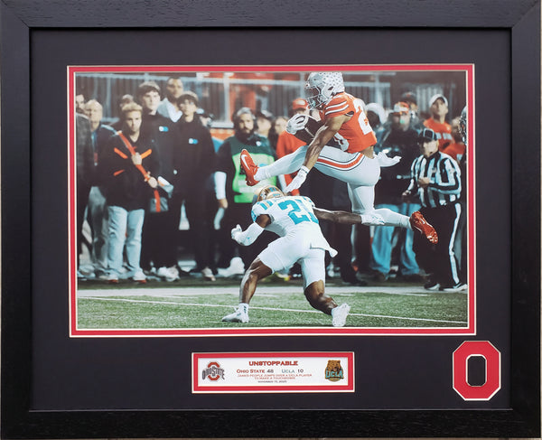 Celebrate the Ohio State Buckeyes 2025 victory over UCLA with this one of a kind custom framed picture. Featuring the moment James People Hurdles over a ULCA player to score a touchdown. A truly historic play for the buckeyes. A very special gift for your very special fan.