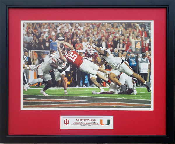 Celebrate the Indiana Hoosiers 2026 CFP National Championship victory over the Miami Hurricanes with this one of a kind custom framed picture. Featuring the moment when Fernando Mendoza ran the ball and scored a touchdown in an absolutely legendary fashion. A very special gift for your very special fan. Undoubtably the centerpiece of any fans collection.